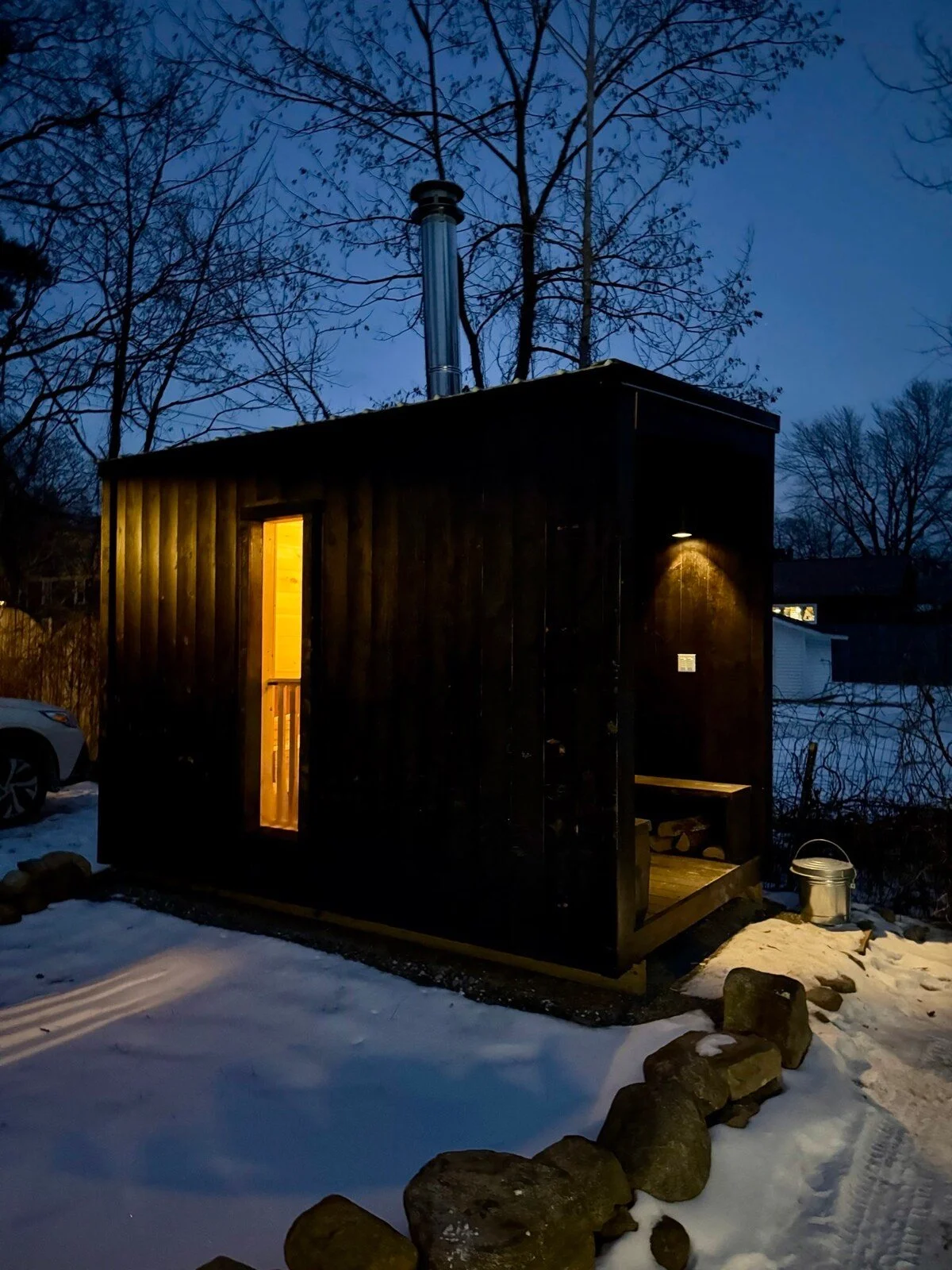 The sauna is a shared amenity with our two other guest rentals, with a signup sheet on the sauna allowing guests to reserve private 2-hour sessions, so it can be enjoyed exclusively by one guest group at a time (full usage details, rules, and safety guidelines are provided in our House Guide before check-in). Custom-built and designed using local Adirondack wood, the sauna cabin was built with Finnish design principles and features shou sugi ban siding, a traditional Japanese method of charring wood. The wood-burning sauna stove can be enjoyed dry or with steam by ladling water over the heated sauna stones. The sauna cabin has a small covered outdoor porch with seats, allowing you to rest and cool off between sauna cycles.
